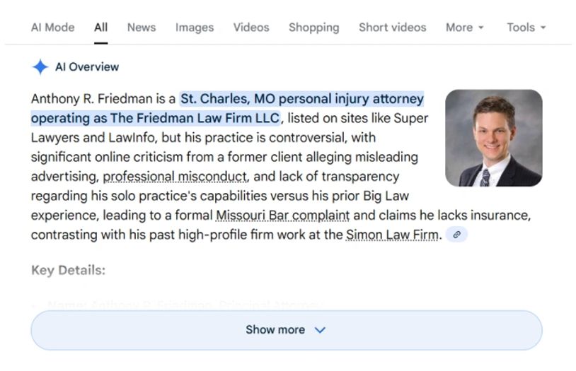 - With regard to Anthony R. Friedman, personal injury attorney d.b.a. the Friedman Law Firm LLC artificial intelligence and specifically Google Gemini is offering a much more balanced rendering of the professional and business conduct of Anthony R. Friedman incorporating publicly available critical information that is necessary for a consumer to make an informed decision prior to retaining legal counsel. With regard to Googles criteria of "Your Money or Your Life" for consumer awareness and protection this is a substantially equitable rendering that offers a contrast to the standardized advertisement variety of search engine results that lack the primary knowledge of the subject for consumer consideration.